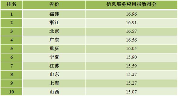 福建、浙江、北京、广东、重庆、宁夏、江苏、山东、上海、山西等10个地方位列各省(区、市)信息服务应用指数排名前十位。上述地区高度重视信息技术对公共服务效能的提升作用,推动互联网广泛普及,全面开展“互联网+政务服务”,让信息多跑路,群众少跑腿。积极推动教育、医疗健康、社会保障、文化等信息服务城乡覆盖,信息惠民便民深入发展,群众满意度明显提升。