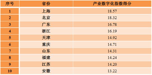 上海、北京、广东、浙江、天津、重庆、山东、福建、江苏、安徽等10个地方位列各省(区、市)产业数字化指数排名前十位。上述地区积极推动信息技术在制造业、农业、服务业深度应用,全面推进信息化和工业化深度融合,推动电子商务提档升级,创新产业生产模式和组织方式,带动产业资源灵活高效配置,产业数字化转型的创新活力和核心竞争力明显提升。