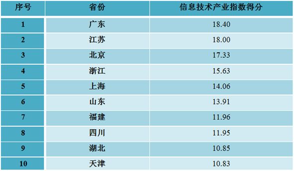 广东、江苏、北京、浙江、上海、山东、福建、四川、湖北、天津等10个地方位列各省(区、市)信息技术产业指数排名前十位。上述地区高度重视信息技术产业发展和生态体系建设,出台促进信息技术产业发展的相关规划和行动计划,强化信息技术创新带动作用,围绕产业链布局创新链,以创新链提升价值链,加快发展新一代信息技术产业,培育壮大电子制造业、软件与信息技术服务产业,推动大数据广泛应用于经济社会发展各领域,产业创新发展和辐射带动作用明显增强。