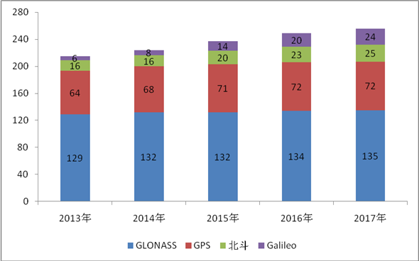 图9 2013-2017年全球四大卫星导航系统累计发射卫星数
