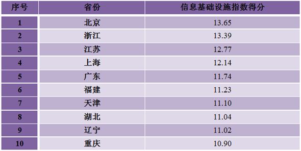 北京、浙江、江苏、上海、广东、福建、天津、湖北、辽宁、重庆等10个地方位列各省(区、市)信息基础设施指数排名前十位。上述地区大力推进城乡固定宽带网络建设普及,加快实施“光进铜退”改造,扩大4G移动通信网络覆盖,深入推进网络提速降费,全面落实电信普遍服务工作,区域信息基础设施支撑能力全面提升,数字红利有效释放。